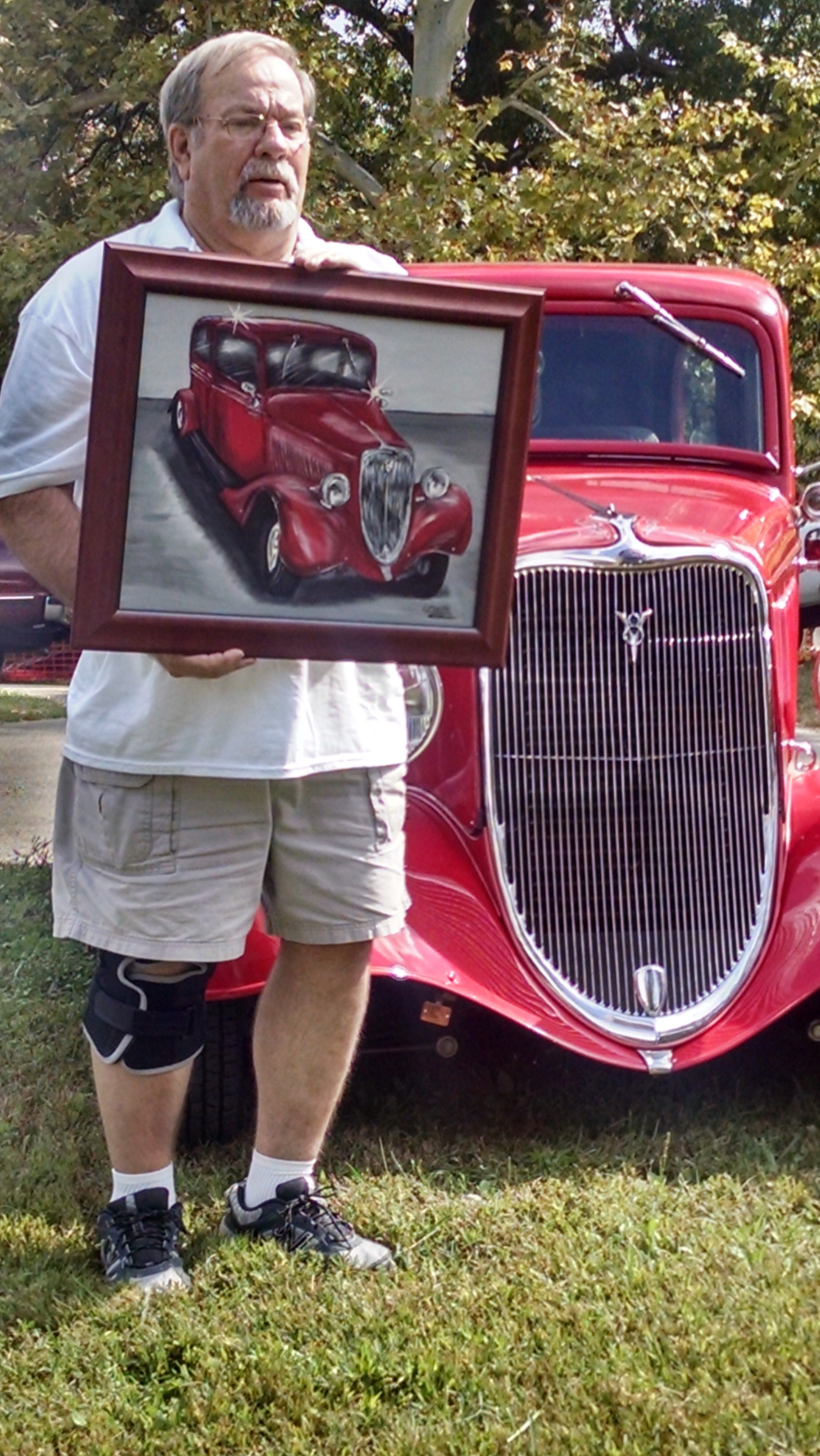 Dave’s wife had this painting presented to him in August 2014 at the Louisville Street Rods Car Show at Iroquois Park as he is a member of the car club and had bought this car when he was 19 years old for $25 and has put his heart into the restoration of the car over the years. His wife said his car has always been his baby and she wanted him to know she loved the way he loved his car as it is such a treasure to them both. Due to health issues Dave is not able to drive his Sedan or be as active with the collector item like he was in his younger years but his wife continues to drive him to the local shows in his car so he can still  proudly display his baby for all to enjoy.. A very proud moment it was to see the presentation of this painting to Dave as a gift from his wife….