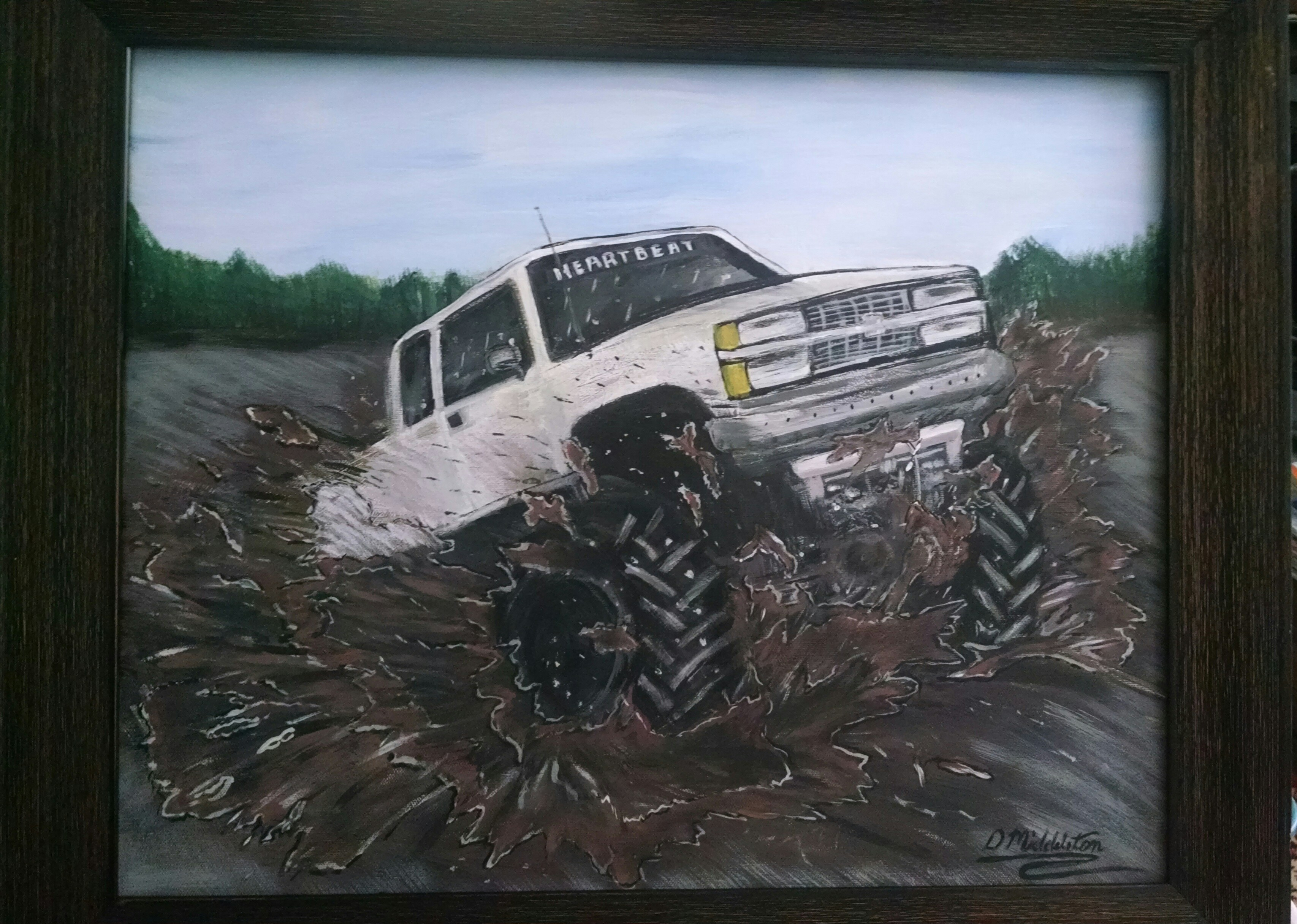 Some of my favorite memories from my younger years are the mud runs we were a part of.  Nothing like the  night air outdoors, the sound of the crowd cheering on , the  roar of the engine of the Chevy 4×4 truck plowing through the mud nd giving it’s all. Having it on a canvas anytime you pass by to remind you of the heart of the Chevy Truck. We simply call it COUNTRY !!!
