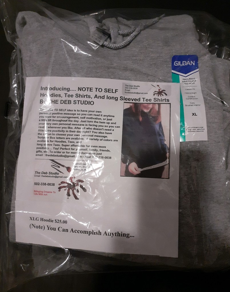 The NOTE TO SELF idea is to have your own personal positive message so you can read it anytime you want for encouragement, self motivation, or just a little lift throughout the day. Just turn the hem up and your very own personal message will be facing you so you can read it anytime you like. After all, who doesn’t need a little extra positivity in their day, right? You also have the option to choose your own personal message that will appear on the hem of your item. (Box Letters Or Script) A positive affirmation, an inspirational message, etc. We have a variety of colors available for Hoodies, Tee Shirts , and Long Sleeved Tee Shirts. Super affordable for even more positivity….YAY!! Perfect for yourself, friends, family, as a gift for someone, etc. Prices are as below and shipping is available as well.