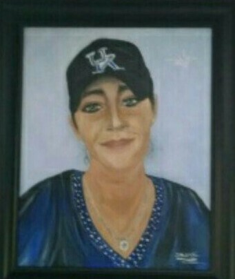 This painting was a special gift to the family of JuLee as my daughter and JuLee were High School best friends and JuLee she was like one of my own children to me (an emotional painting for me …..to say the least). We lost her in Feb 2015 at such an early age with so much still to do with her life. The painting by far cannot do justice to her beauty as she was beautiful inside and out in so many ways. A warm, caring, loving, always smiling, dedicated mother of two beautiful children, upbeat person who found the good in everyone she met. JuLee had very pretty long hair and the UK fan loved wearing her ball cap and UK shirts so the painting was done from a family favorite photo of JuLee sporting her UK pride and loyalty. She is greatly missed every day by all who were touched by her life. The presence of JuLee is felt by her family, friends, and children still and always will be. While portraits are not my strongest suit, I felt so drawn to do this painting when we lost her and I wasn’t even sure I could do it as she was close to my heart. It was kept a secret so to speak until I knew I had completely finished it . We are all very blessed to have known such a beautiful soul.